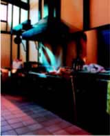 通り庭(台所部分)を床上げし、土タイル貼とし床暖房設備を設け、吹き抜け空間のキッチンに改修。