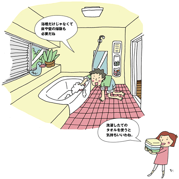 人が健康的に暮らすためには、身体を清潔に、衛生的に保つことが必要です。日本は高温多湿なので暑い日には汗をたくさんかいて、皮膚がベトベトになります。そこで入浴して、顔や頭、身体を洗います。そして身につける衣服も小まめに洗って、きれいにしておきます。入浴は汗や汚れが落ちて、さっぱりした気分になるだけではなく、身体全体が温まって気持ちよく眠ることができます。 さて、お風呂に入ったり、毎日清潔な服を着るには、どんな家事をしなくてはならないのでしょうか。 浴室は、他の部屋よりも温度が高く湿気が多いことに加え、垢(あか)や石けんカスなどのカビが発生しやすい条件がそろっている場所です。このカビはアレルギー等の原因となったりします。そういった状態を放っておくと建物の寿命にも影響がでてきます。日頃のこまめな掃除に加え、通風や換気をよくすることが欠かせません。 また、汚れた衣服やタオルを洗濯して清潔なものを用意しておくことも大切です。 最近の入浴は身体を清潔にする衛生面だけでなく、ゆっくりリラックスするという精神面の効果も考えられ、浴室をくつろぐ空間にするための工夫も必要になっています。
